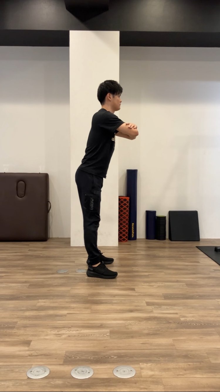 上体が前に倒れると人によっては、重心がつま先側へ移動し踵が浮いたような状態でスクワットを行うことになってしまいます!